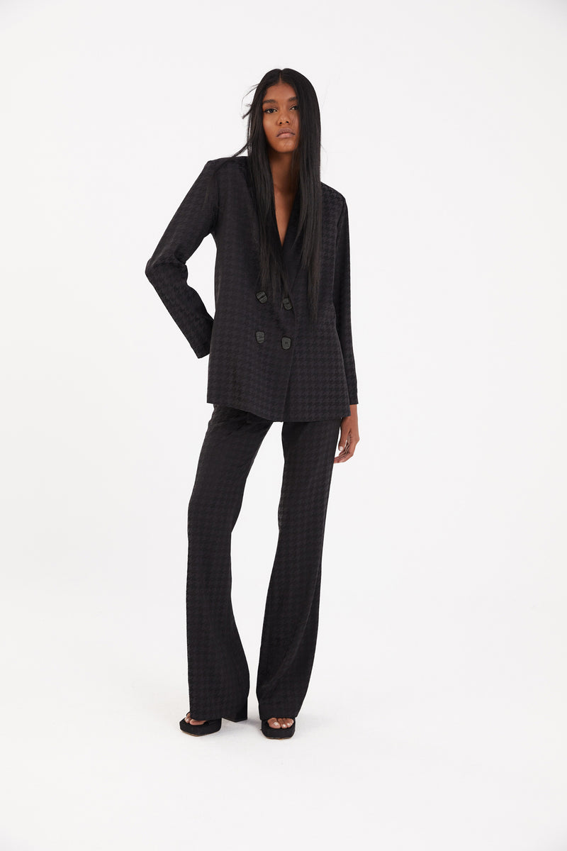 Our most iconic garment, the Icon jacket, a jacket crafted from a houndstooth jacquard print fabric in black. Our four-button pyjama jacket, an unstructured, fluid jacket with a relaxed fit and blazer neckline. With four contrasting ecru-coloured buttons that have become our hallmark.