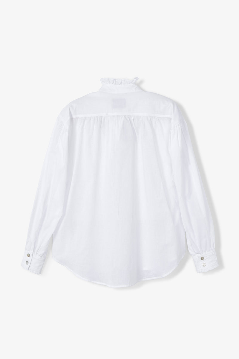 Chemisier blanc en tissu léger, offrant confort et style tout au long de la journée. Volants à l'encolure et boutonnage sur le devant, parfaits pour un look romantique et féminin.