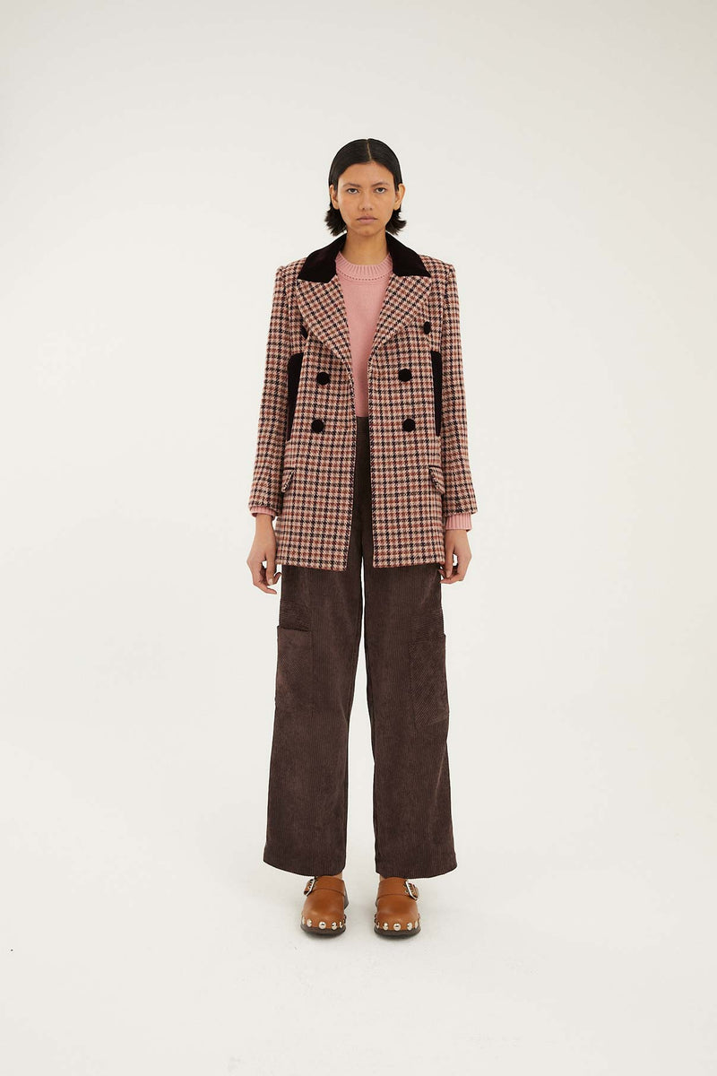 Blazer à double boutonnage en tissu à carreaux roses. Col à revers, épaule marquée et manches longues terminées par quatre boutons. Revers et boutons en velours. Poches avant à rabat et double boutonnage sur le devant.