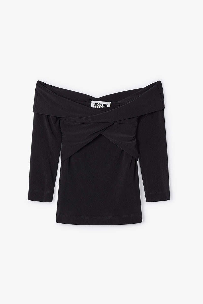 Corps tricoté ajusté en noir. Encolure croisée sans bretelles, épaules tombantes et manches trois-quarts.