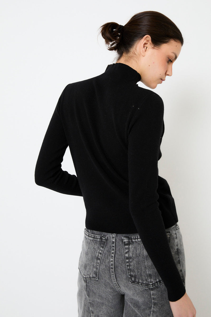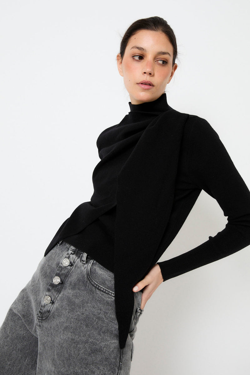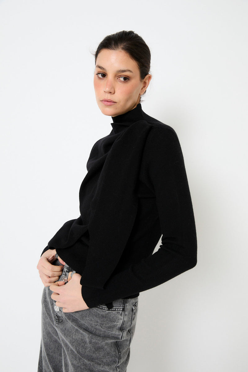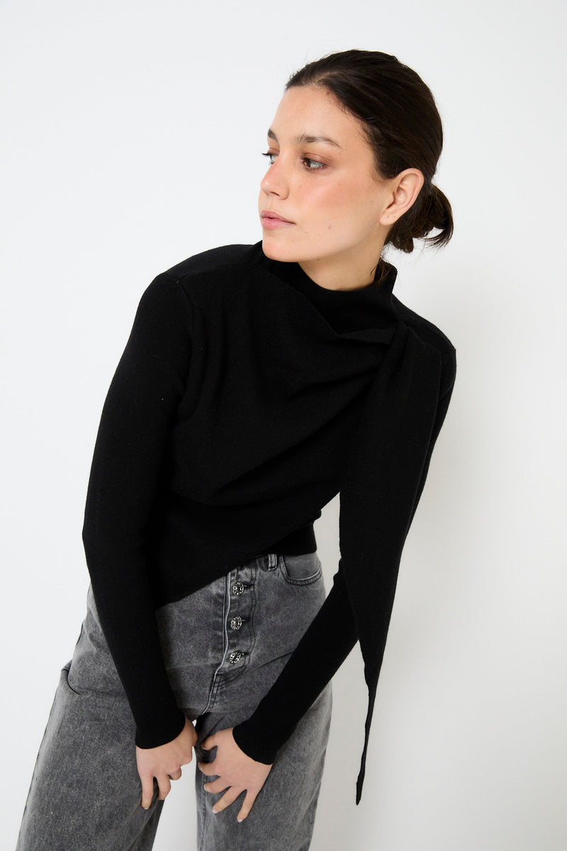 Pull en maille noir. Il présente un col cheminée et un drapé latéral qui tombe depuis l'épaule, créant un effet enveloppant.