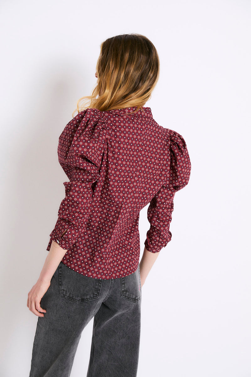 Blusa de algodón en tono burdeos con estampado de pequeñas flores. Presenta un diseño entallado con manga larga abullonada en el hombro, que aporta volumen y estructura a la prenda. Cuello redondo tipo mao y cierre frontal con botones nácar.