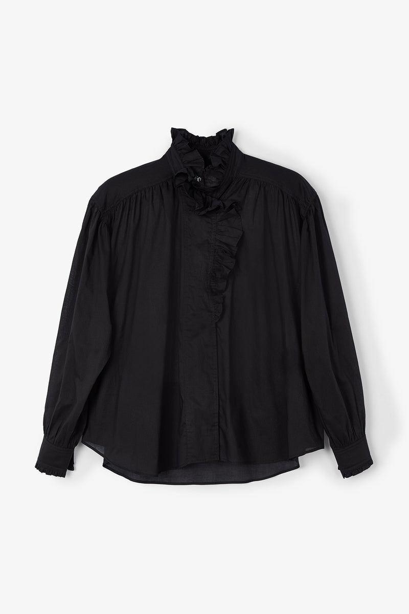 Blusa negra con volantes en el cuello y botonadura frontal, perfecta para un look romántico y femenino. Confeccionada en tela ligera, ofrece comodidad y estilo durante todo el día.