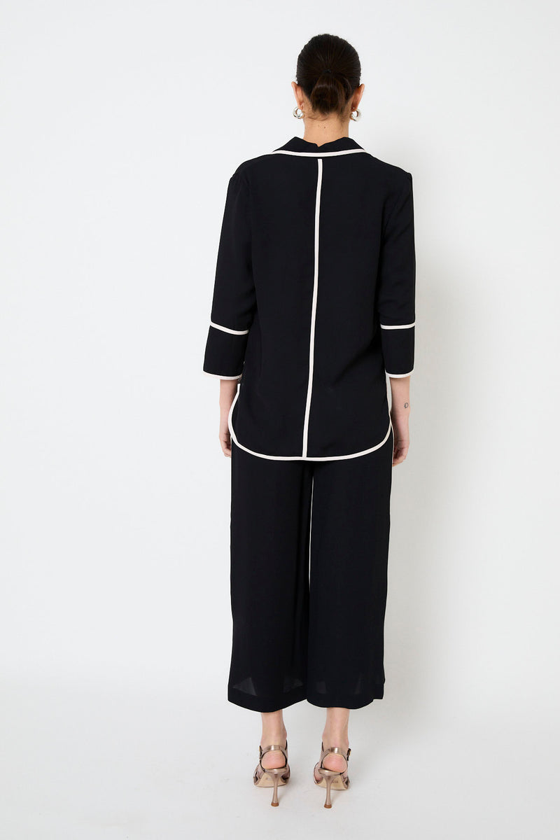 Chaqueta estilo pijamero de color negro con ribetes blancos que bordean el cuello, la parte frontal, los puños y los bolsillos. Tiene un corte recto y cuenta con cuello solapa redondeado. Se abrocha con tres botones en la parte delantera y presenta dos bolsillos de parche en la parte inferior delantera.