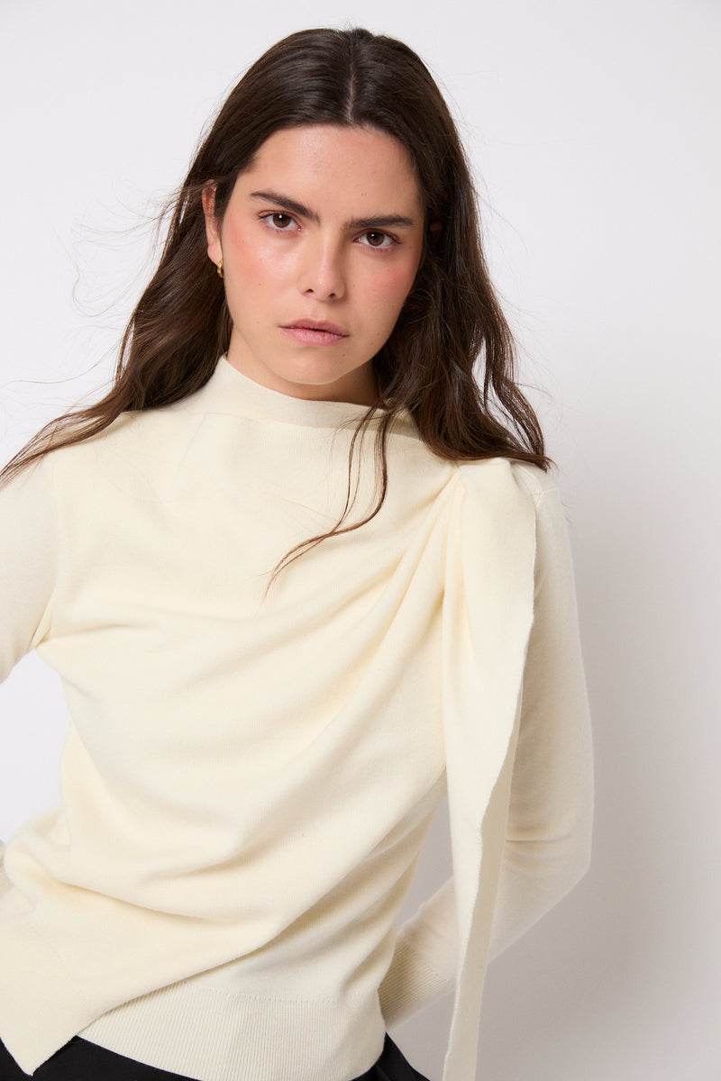 Jersey de punto en tono crudo. Presenta cuello chimenea y un drapeado lateral que cae desde el hombro, creando un efecto envolvente.
