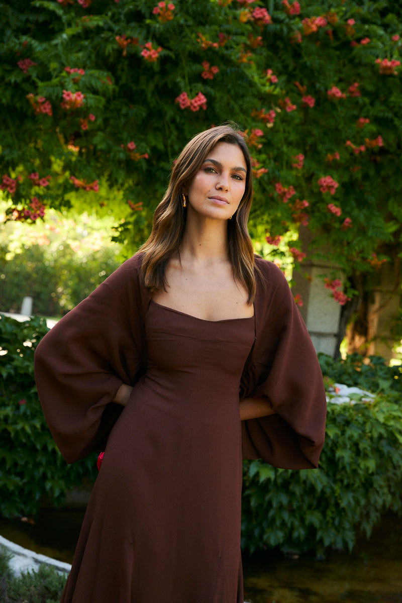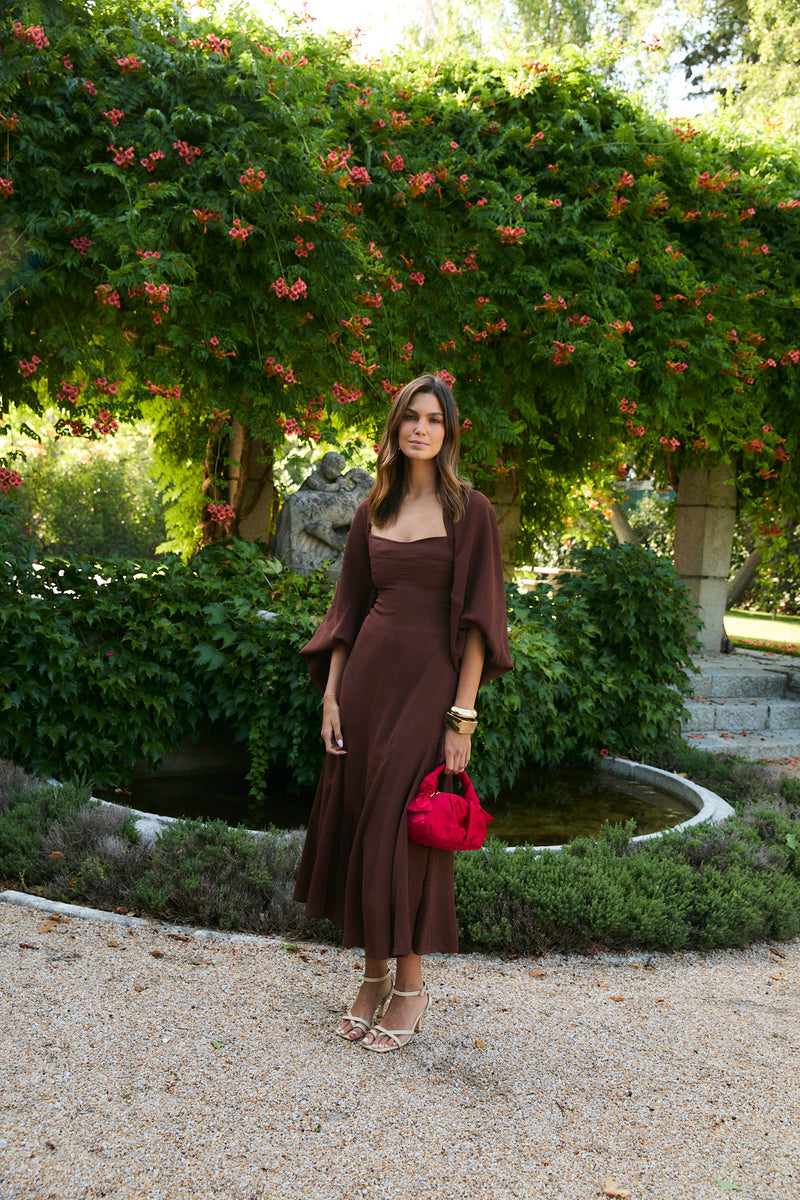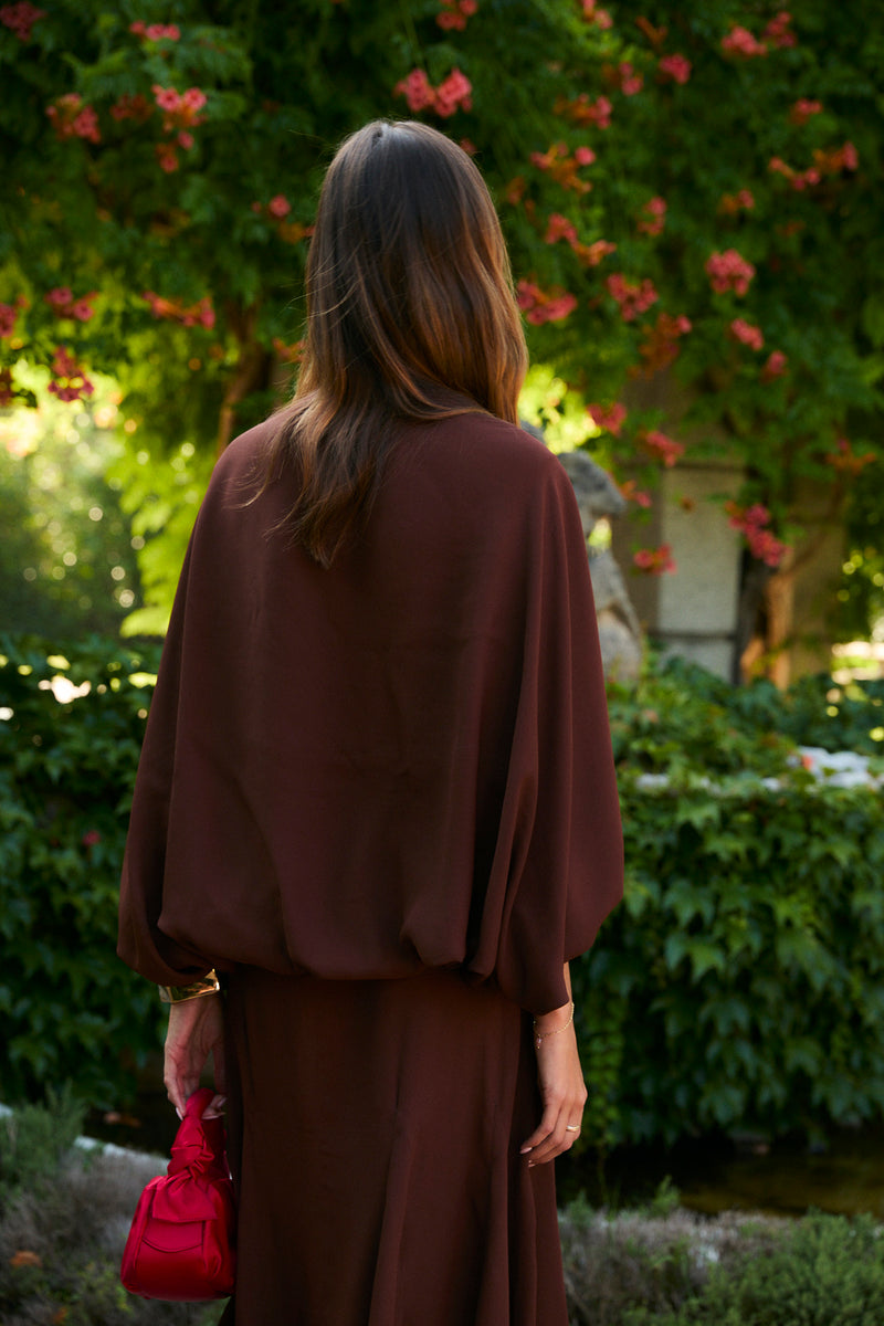 Esta capa en tono marrón confeccionada en un tejido de crepé fluido, presenta unas mangas tipo murciélago muy amplias que da movimiento a la prenda. Su caída suave envuelve los hombros y la espalda sin cierre visible. Ideal para combinar sobre vestidos del mismo tono o en contraste, aporta un toque de distinción a looks de invitada o eventos especiales.