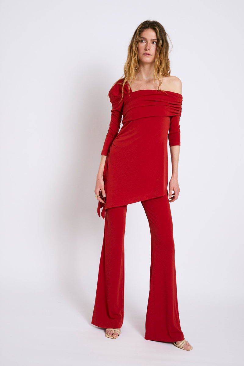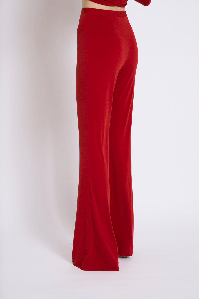Pantalón de tiro alto confeccionado en punto con un tejido cómodo, elástico en la cintura y bajos acampanados.