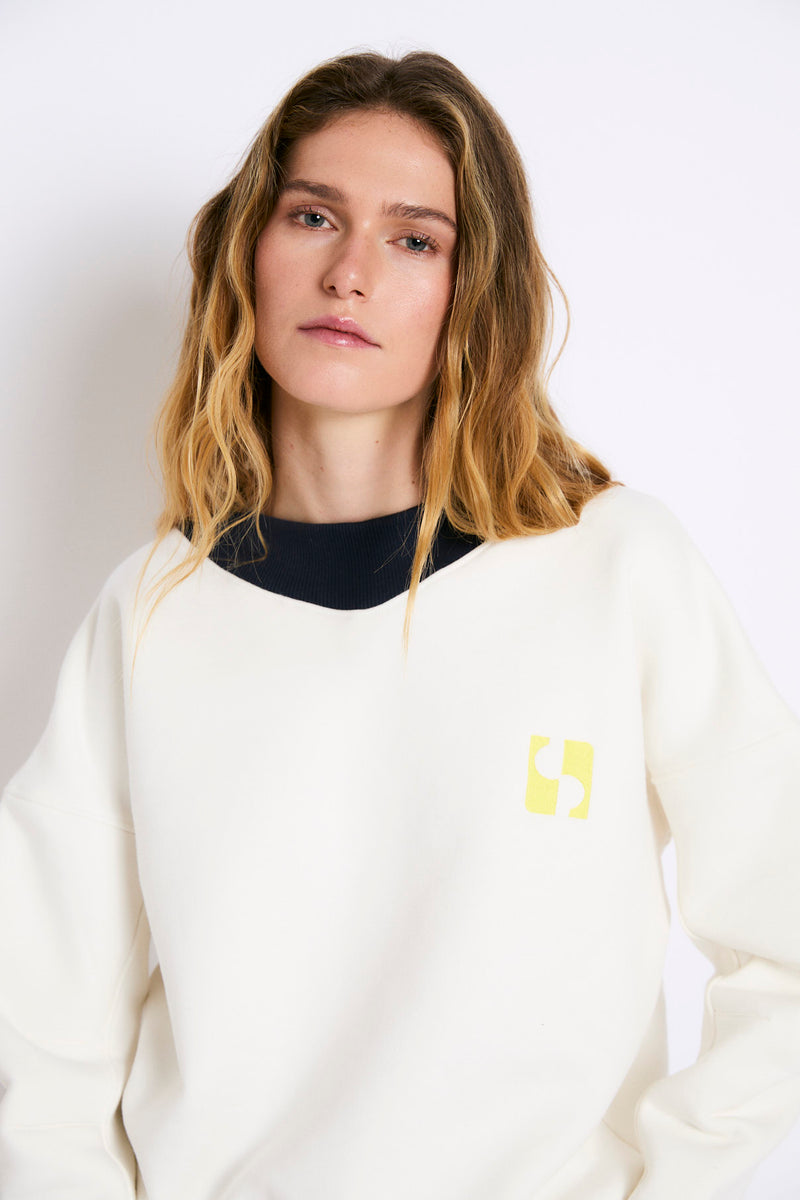 Sudadera de corte relajado en color crudo, con cuello redondo y detalle interior en contraste negro. Presenta manga caída y acabados de canalé en puños y bajo. Lleva un pequeño gráfico de nuestro logo en amarillo en el pecho.