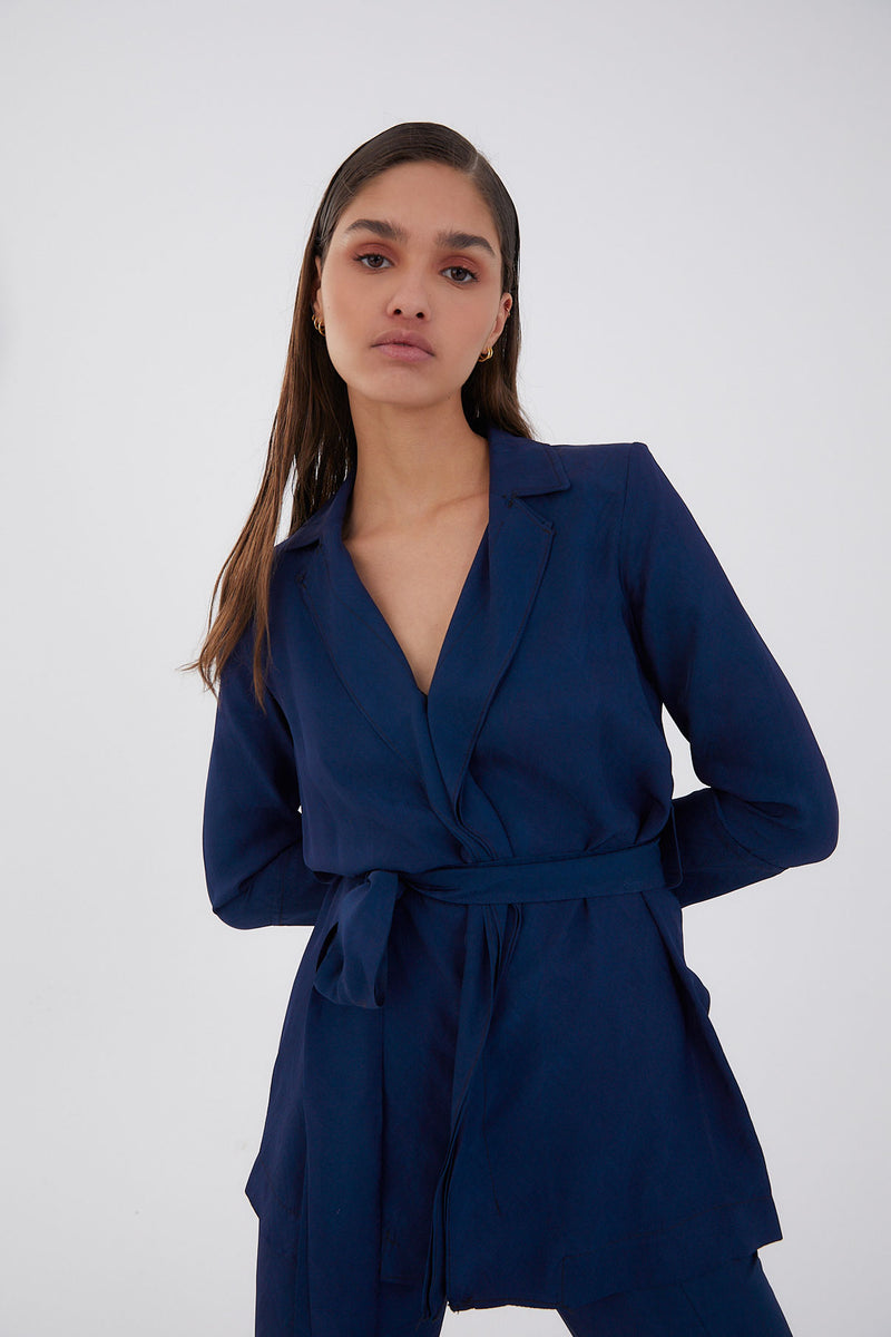 Total Look Lion, compuesto por una chaqueta confeccionada en tejido viscosa en color azul marino. La chaqueta es de manga larga con hombreras marcadas y escote en forma de pico. Chaqueta pijamera desestructurada, fluida con fit relajado, cerrada con un cinturón anudado de mismo tejido. Y nuestro pantalón de tiro alto más icónico, confeccionado en tejido jacquard. El pantalón Icon es campana con pliegue central que hace que estilice las piernas y dé mucho movimiento. El cierre es lateral con cremallera invisible y cinturilla rígida.